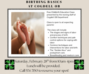 Birthing Basics at Cogdell OB Join us Saturday, February 28th 10 am – 4 pm Lunch provided Call 325-574-7150 to reserve your spot!